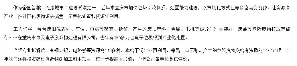 從2010年開始,公司就是重慶市政府公開招投標(biāo)確定的重慶市電子廢棄物處理特許經(jīng)營權(quán)企業(yè),在重慶市“一小時經(jīng)濟圈”范圍內(nèi)23個區(qū)縣,開展電子廢棄物綜合回收機處理處置業(yè)務(wù)。